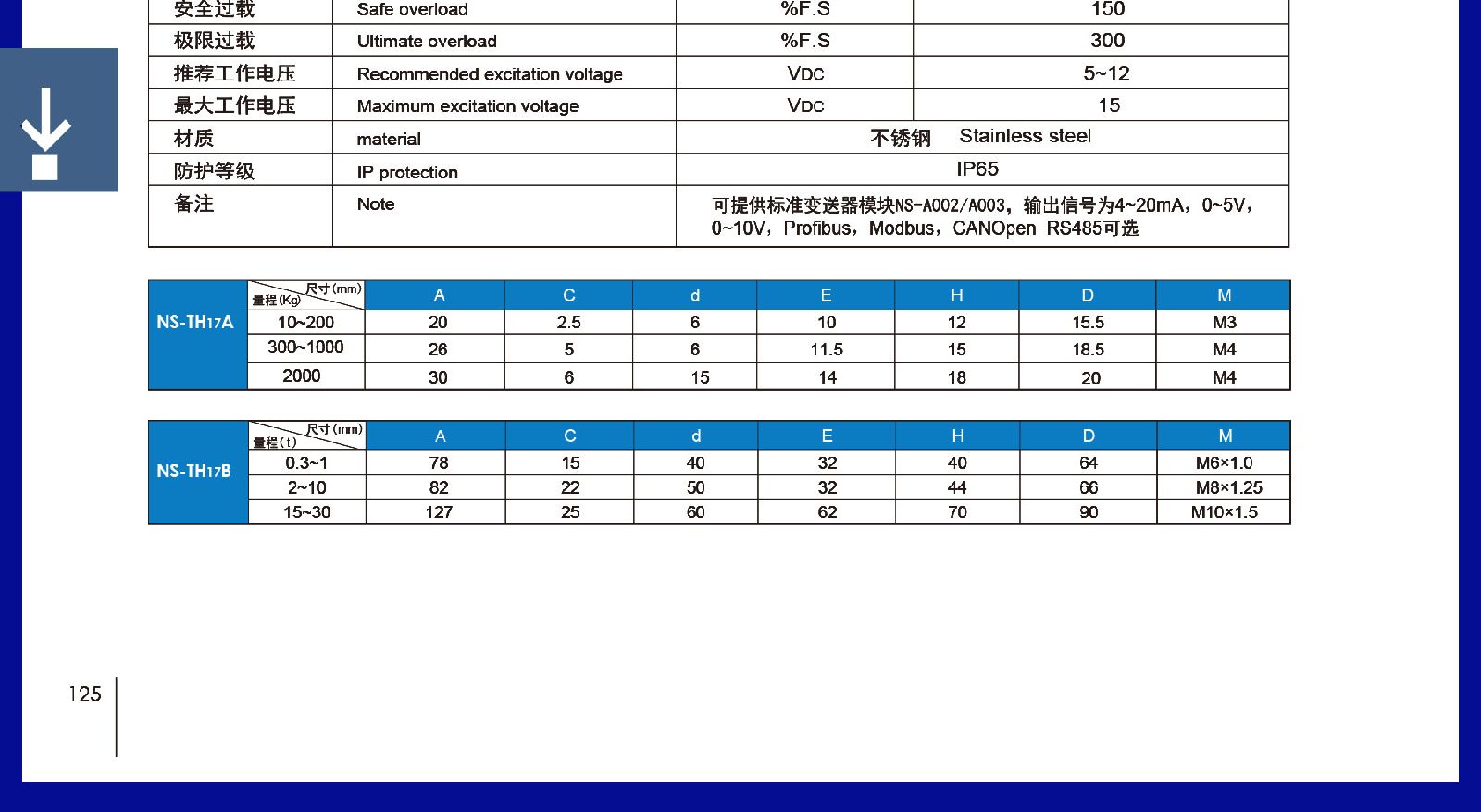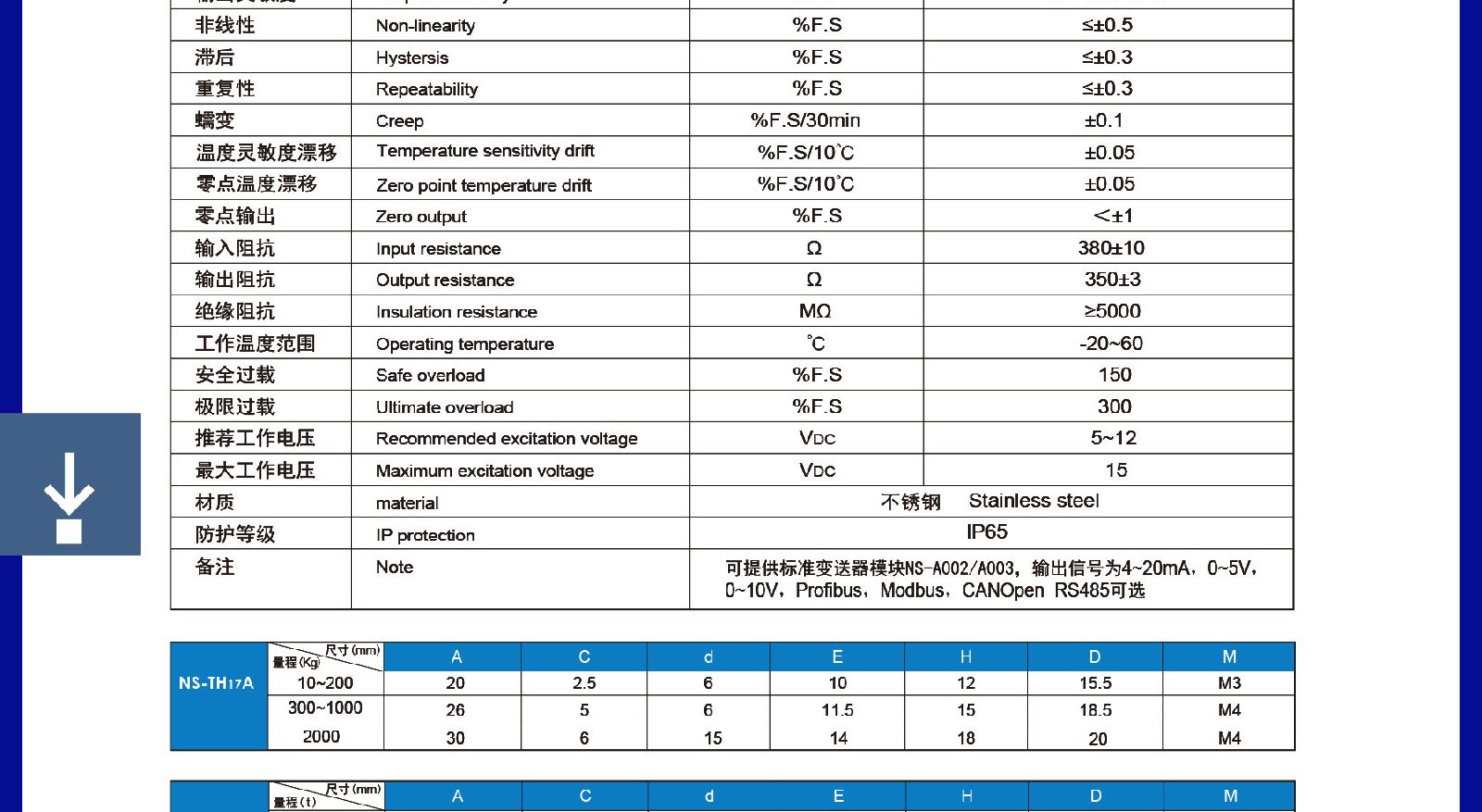> 天沐NS称重传感器代理全不锈钢材质轮辐式升级产品IP65NS-TH17AF