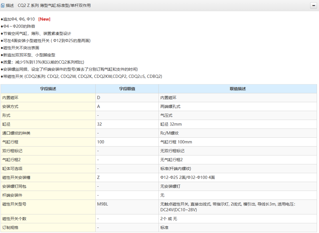 > SMC CQ2 Z 系列 薄型气缸:标准型/单杆双作用CDQ2A32-100DZ-M9BL